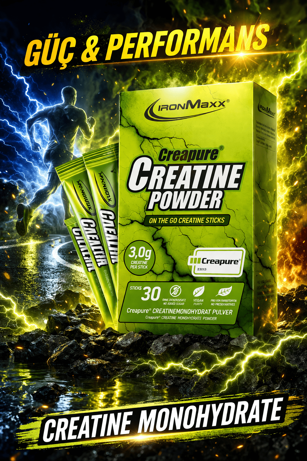 IronMaxx® Creatine Monohydrate with Creapure®, ultra saf kreatini kullanışlı stick formunda sunar – sporcular için mükemmeldir.